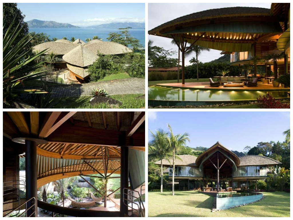 A primeira casa sustentável está localizada em Angra dos Reis, no Rio de Janeiro. O projeto que tem cobertura em forma de folhas, buscou inspiração em arquiteturas brasileiras indígenas, fruto de climas quentes e úmidos.