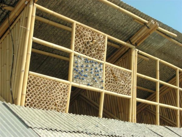 Os pisos e paredes foram feitos de bambu, e projetados para que o vento possa penetrar por todo o edifício, diminuindo sua temperatura interior.