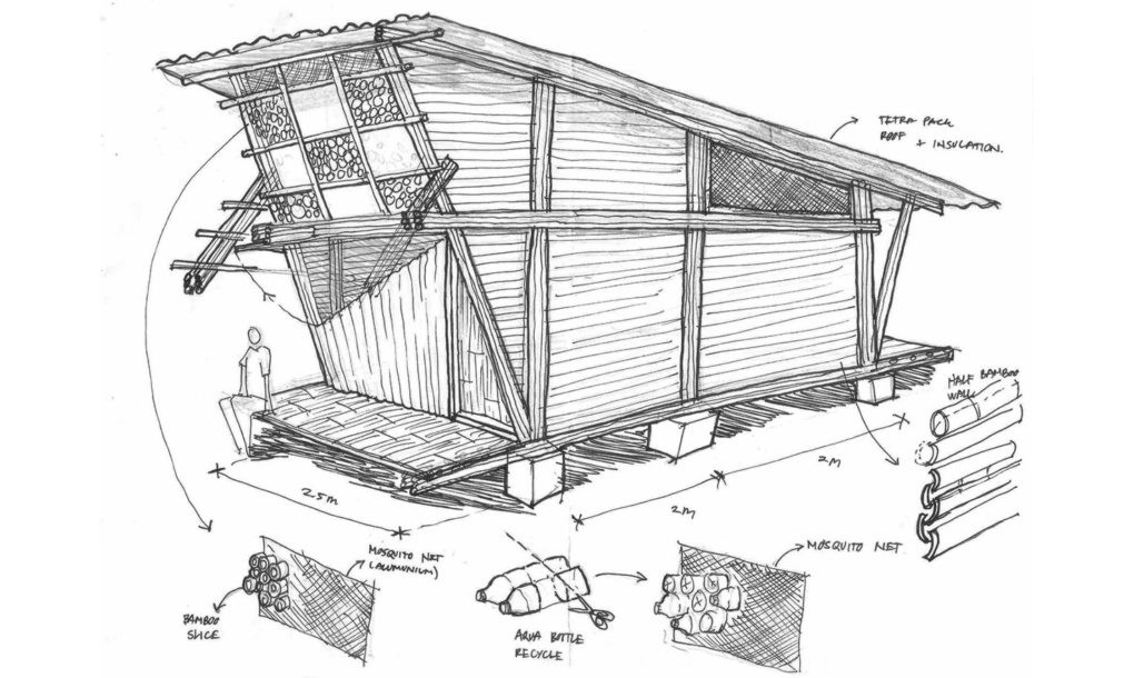 Foram utilizadas garrafas recicladas e embalagens tetra pack para cobertura e isolamento.