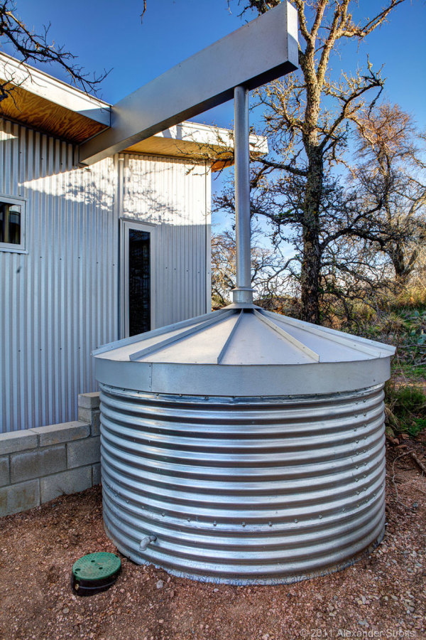 O telhado foi projetado com a inclinação adequada para coletar as águas da chuva e direcionar para cisternas adjacentes a cada cabana, que conseguem armazenar quase 5 mil litros de água.