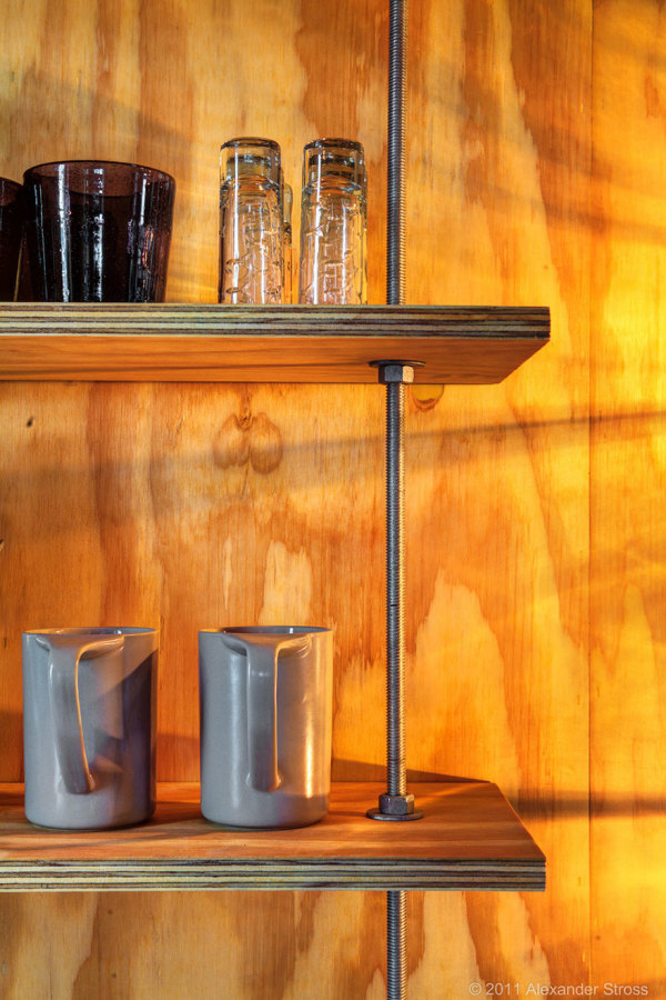 Os revestimentos também seguiram o conceito sustentável, o piso de concreto polido e as paredes de madeira compensada, além de componentes estruturais são acabamentos atraentes o que torna desnecessário o uso de acabamentos adicionais.