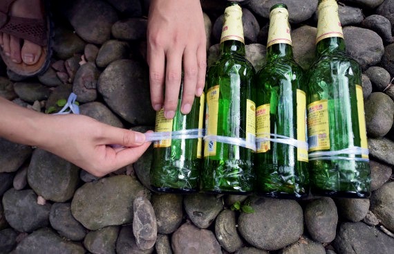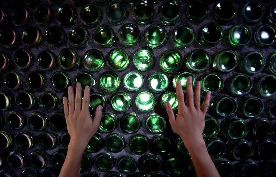A cerveja é a bebida alcoólica mais popular do mundo, e suas embalagens geram muitos resíduos. As garrafas de vidro podem ser recicladas, mas aqui foram reutilizada e viraram o principal elemento desta construção.