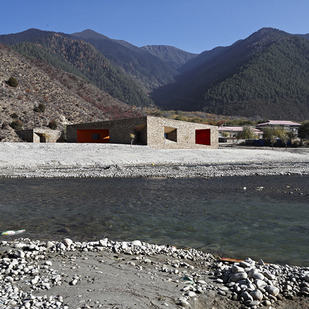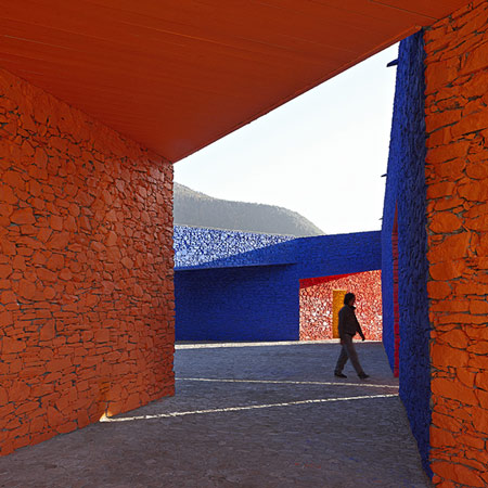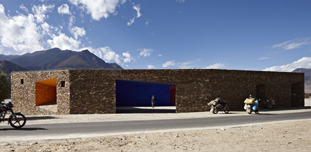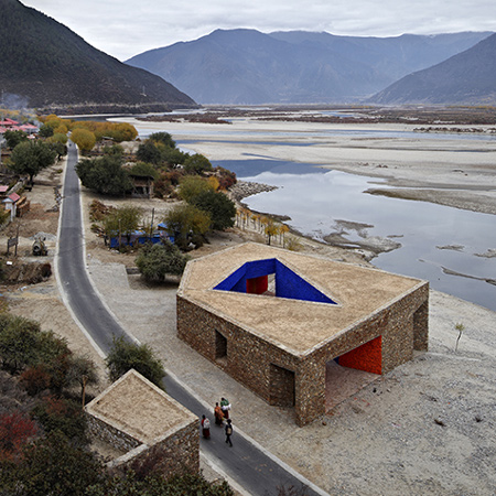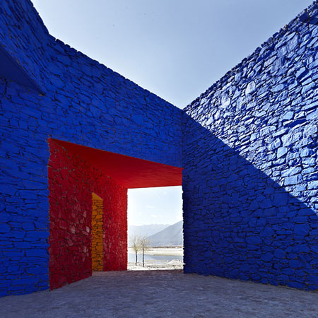 A cor é um elemento fundamental na cultura visual do Tibet. Nós introduzimos cor na instalação interior do espaço público. Os pigmentos minerais locais estão diretamente pintados nas superfícies da pedra .