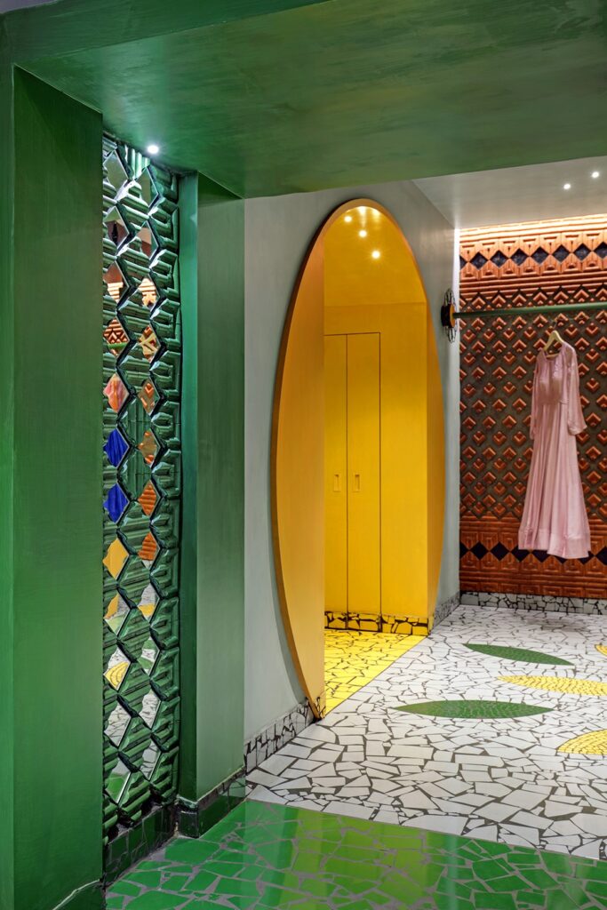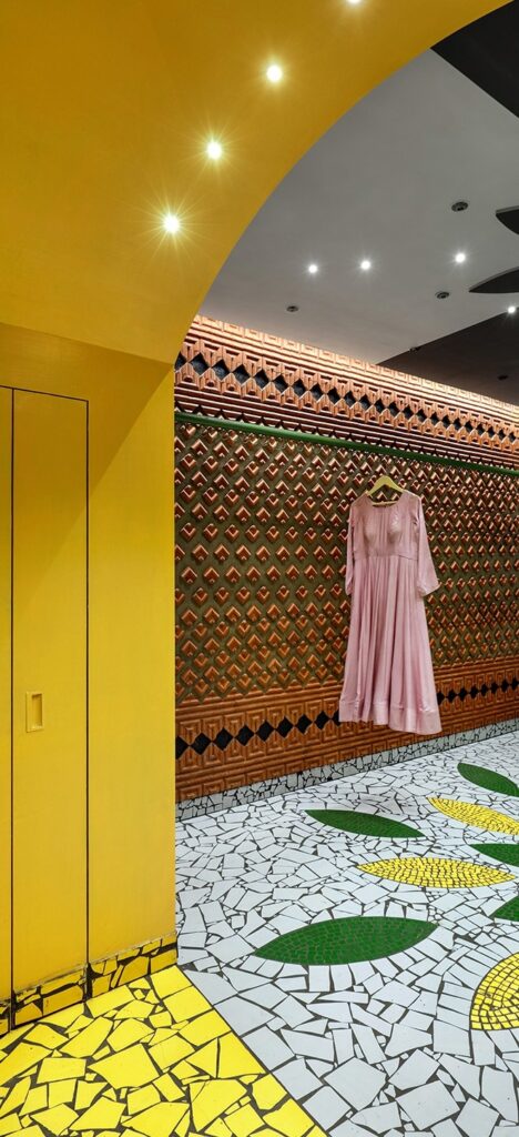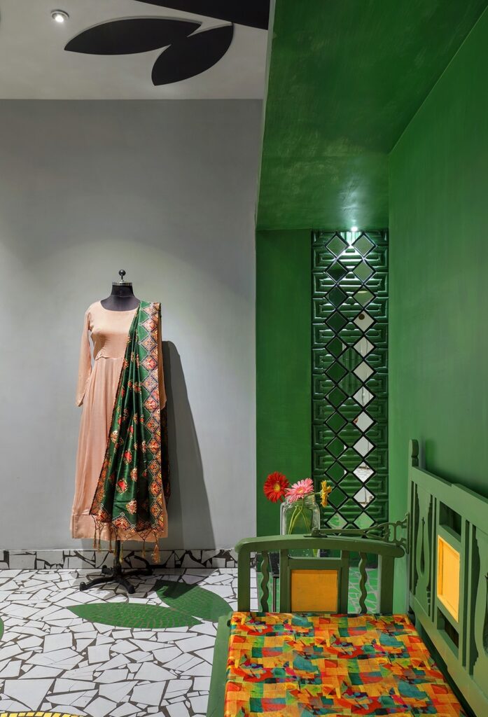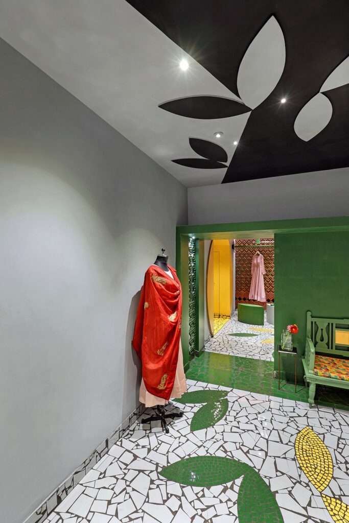 A loja Shefalli’s Studio traz o conceito da moda indiana tradicional com uma roupagem e influencias do mundo ocidental e contemporâneo, assim como a arquitetura de Manoj.