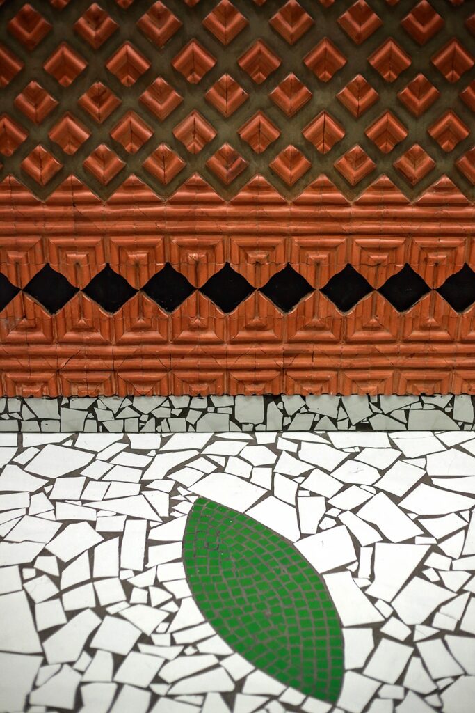 A telha cerâmica que pode ter sido danificada ou quebrada, dá as paredes da loja uma textura que com efeito dramático.