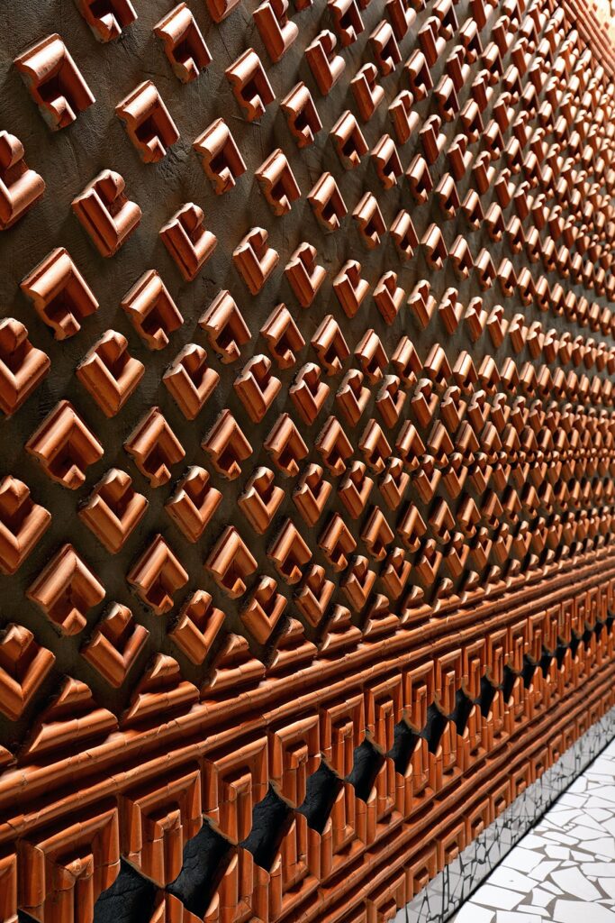 Resíduos de telha de cerâmica, garrafas de cerveja, pedaços de pisos danificados, venezianas danificadas, restos de tecidos e partes de mobiliário são só alguns exemplos de materiais reaproveitados para esse projeto.