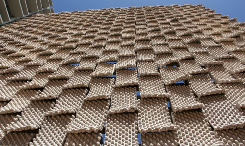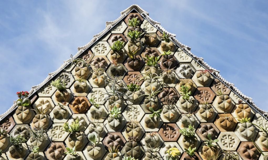 Feitas com um pouco de cimento Portland, serragem, chardonnay e outras combinações, as peças são organizadas de maneira a criar uma parede de jardim vertical, capaz de manter a vida vegetal como as suculentas que prosperam no clima do norte da Califórnia.