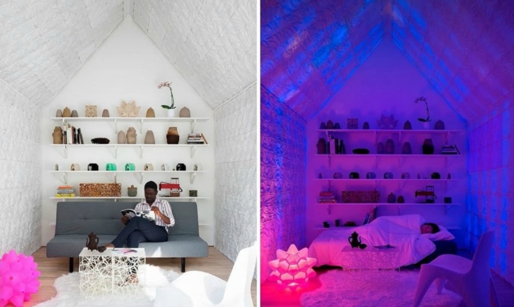 No interior, as paredes da pequena casa impressa em 3D são revestidas com o “Chroma Curl Wall“, outro material inovador da empresa, feito com um plástico de base biológica derivado do milho, que apresenta texturas de relevo personalizadas e ilumina o interior (assim como o exterior) com luzes LED que mudam de cor.