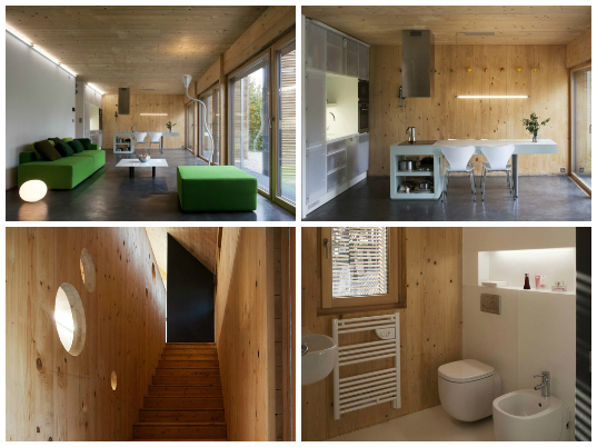 Todos os cômodos estão voltados para a fachada sul, como está localizada no hemisfério norte é fachada que recebe mais radiação solar, onde estão localizados os painéis fotovoltaico.