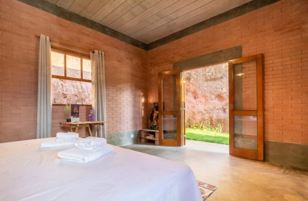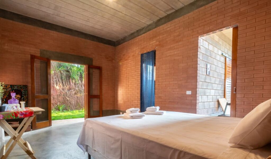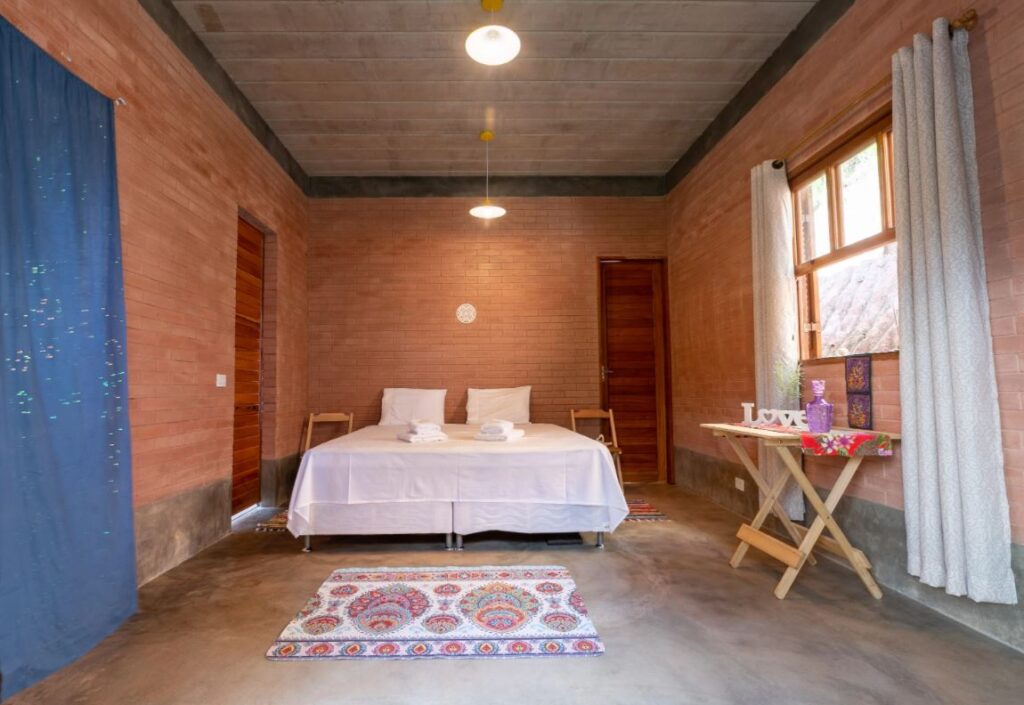 Para estar compatível à tudo isso a casa conta com design integrado a natureza, ciclo completo da água, paredes de taipa de pilão feitas com terra do próprio terreno.