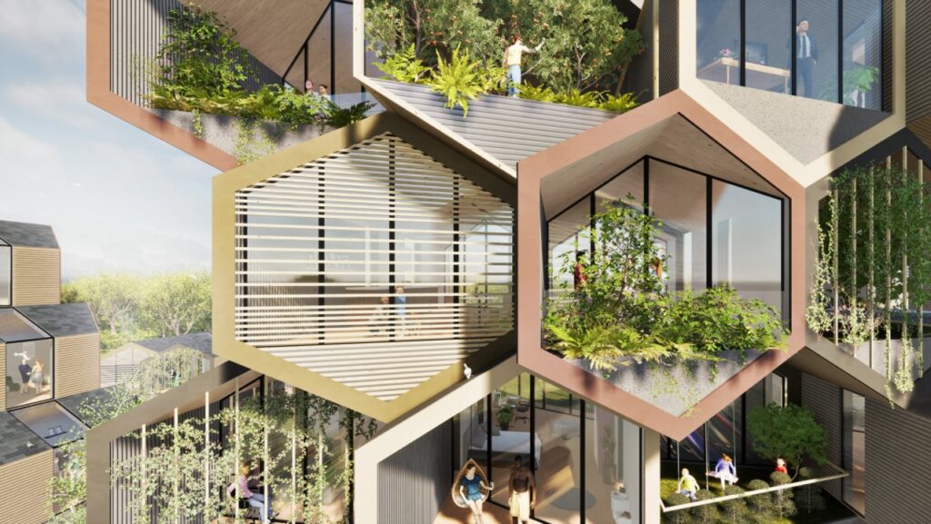 Como parte do concurso de design The Home of 2030 da RIBA , o escritório Gianluca Santosuosso Design de Londres criou o The HIVE Project (Human-Inclusive & Versatile Ecosystem), uma solução modular de casas biofílicas com baixo teor de carbono e energia.