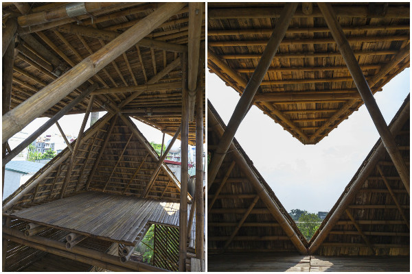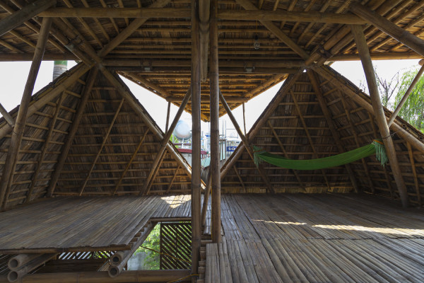 As varas de bambu utilizadas possuem 8-10cm, 4-6cm de diâmetro, e 3,30m, 6,60m de comprimento. A estrutura modular foi montada por meio de parafusos.
