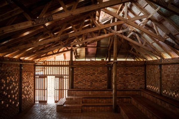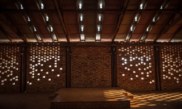 O edifício não tem janelas, em vez disso, espaços entre os tijolos intercalados, claraboias e as lâmpada PET deixam a luz em diferentes direções e iluminam a área do palco.