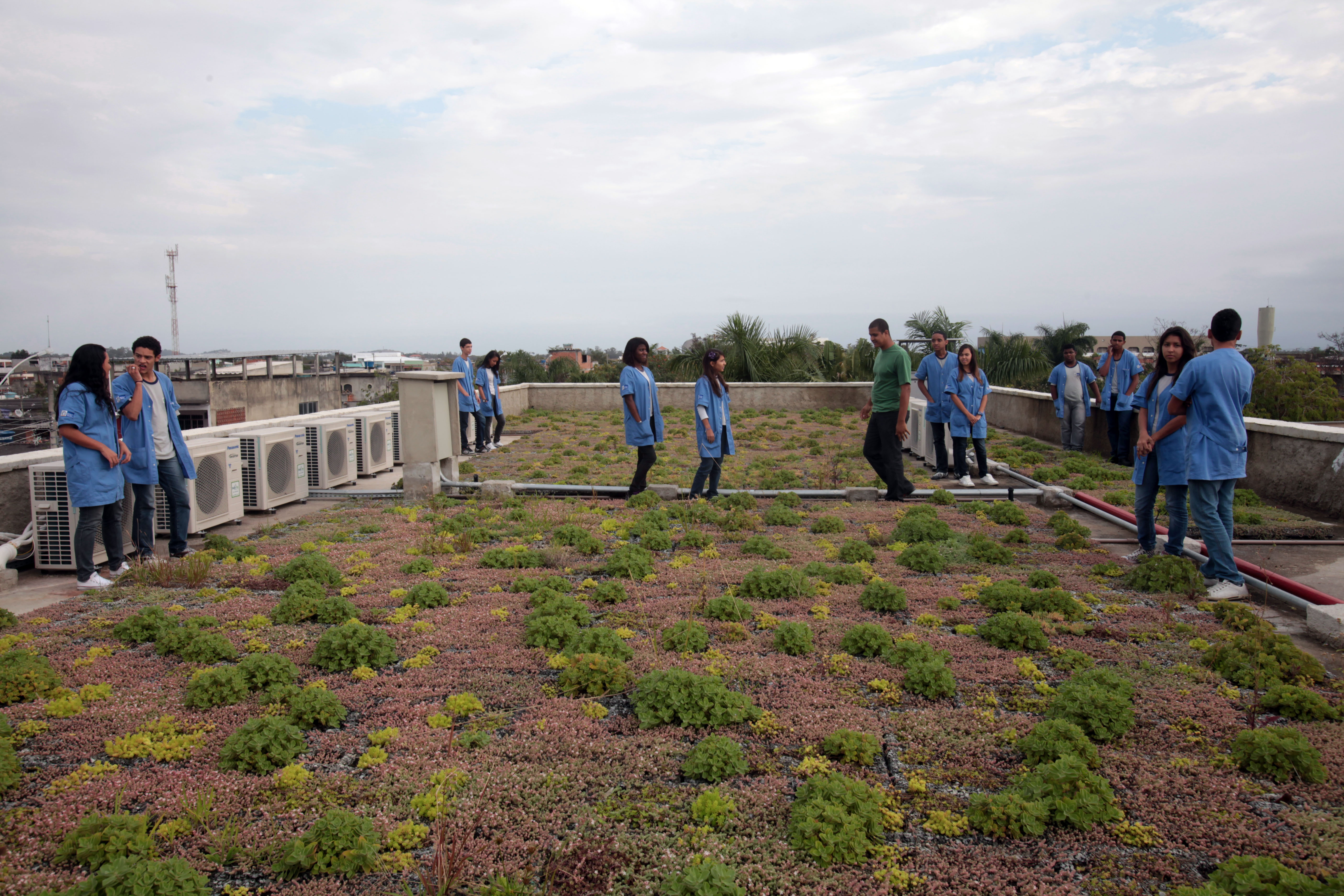 O telhado verde é outro destaque do projeto, o espaço é usado para aprendizagem, e conta com uma vegetação especial para diminuir a absorção de calor e reabsorver a água da chuva.