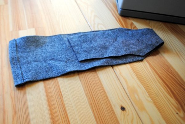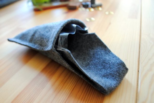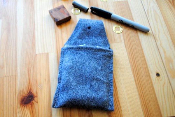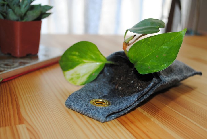 Depois de cortar o feltro conforme o molde, dobre a borda e costure uma bainha. Em seguida, dobre um pedaço do feltro e costure as duas laterais para formar um bolso para a planta. O resultado final desta etapa deve ficar igual a foto abaixo.