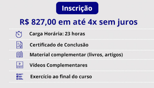 O curso é dividido em 8 módulos semanais compostos por vídeo-aulas com duração variada de 1:30 a 2 horas por módulo, acrescidos de material didático para estudos, leituras e exercícios complementares para melhor assimilação do conteúdo, totalizando, 3 meses de curso, prazo após o qual será emitido o certificado de conclusão do curso.