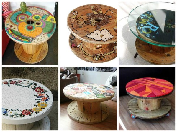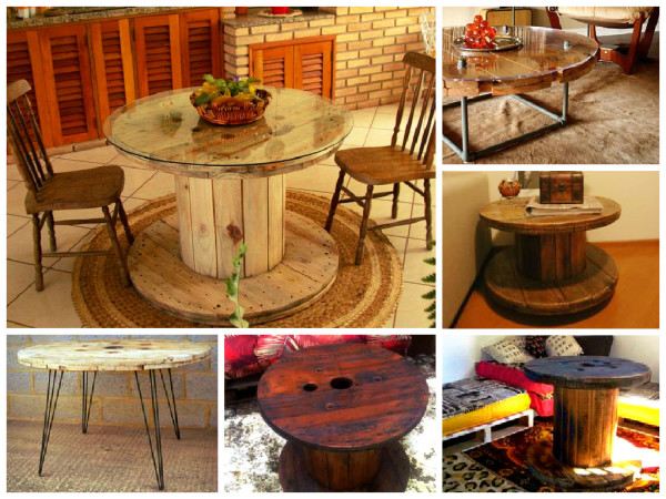 As mesas rústicas podem ser feitas com o próprio centro do carretel, ou utilizá-los somente como tampo com pernas de diversos tipos, até mesmo de canos de cobre.