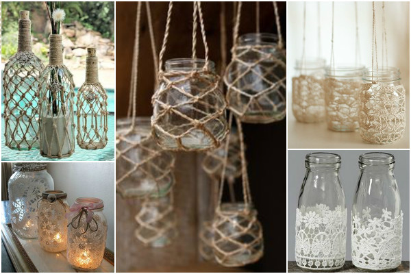 potes de vidro na decoração Macramê e Crochê
