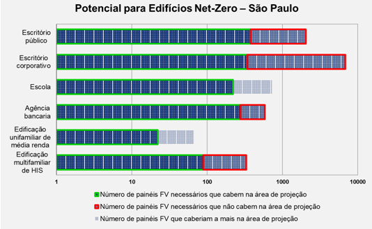 No estudo, foram realizados balanços energéticos para seis tipologias visando zerar o consumo energético e as emissões de carbono anuais através da geração fotovoltaica distribuída, utilizando apenas a área do telhado, por ser a fonte energética que mais cresce no país.