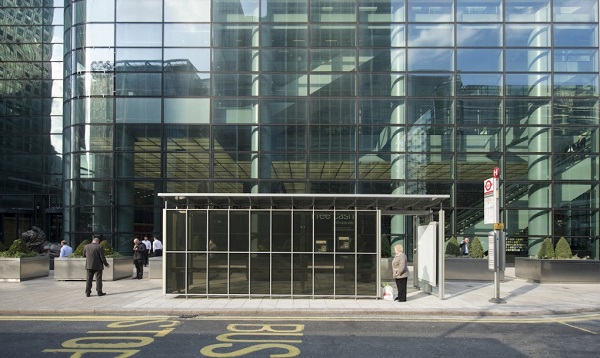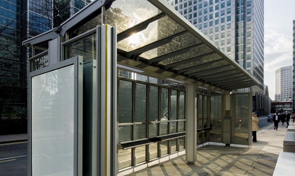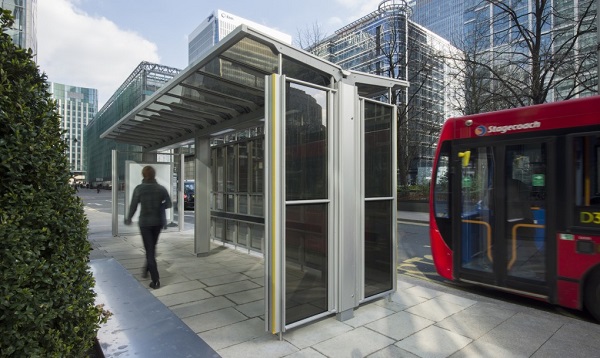 Uma tecnologia inovadora de energia renovável desenvolvida em Londres pela empresa Polyslar, apresentada em conjunto com o Canary Wharf Group, mostra o primeiro ponto de ônibus londrino que produz energia solar.