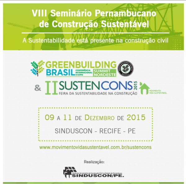 O SINDUSCON/PE, através do Movimento Vida Sustentável – MVS em parceria com o Green Building Council Brasil irá realizar o Green Building Brasil Summit Nordeste & II SUSTENCONS, com o intuito de expandir as ações das organizações no Brasil, acompanhando o movimento do mercado em prol da sustentabilidade.