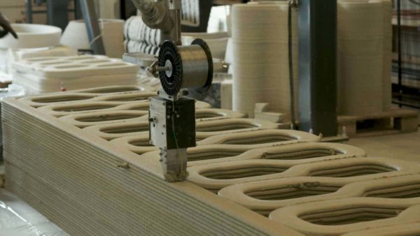 A impressora 3D usada é essencialmente um enorme braço robótico com um bocal que extrai um cimento especialmente formulado, com a textura tipo chantilly.