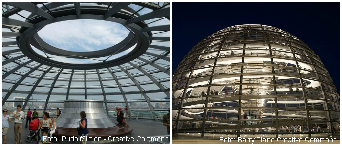 Norman Foster – Um exemplo internacional é o projeto do Reichstag, parlamento alemão localizado em Berlin, que emprega uma cobertura para estabelecer a ventilação natural, através de um cone invertido, também utilizado para iluminação natural, localizado no centro da cúpula.