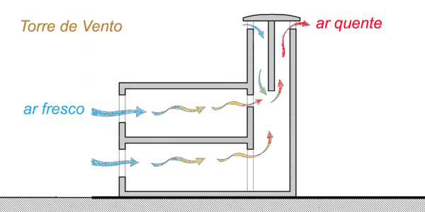 O vento entra por um lado da torre e sai pelo outro, sugando o ar quente interno do ambiente, fazendo que o ar fresco entre por aberturas localizadas na parte inferior da edificação.