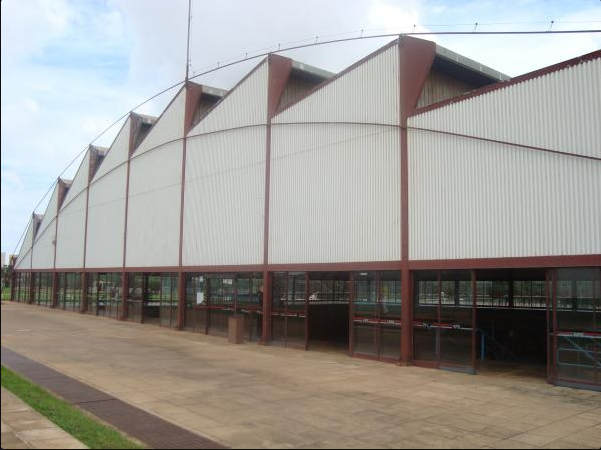 - A cobertura é composta de telhas especiais dobradas em chapa pré-pintadas de aço galvanizado branco, com proteção interna de bidim e forro obilongo metálico por baixo
