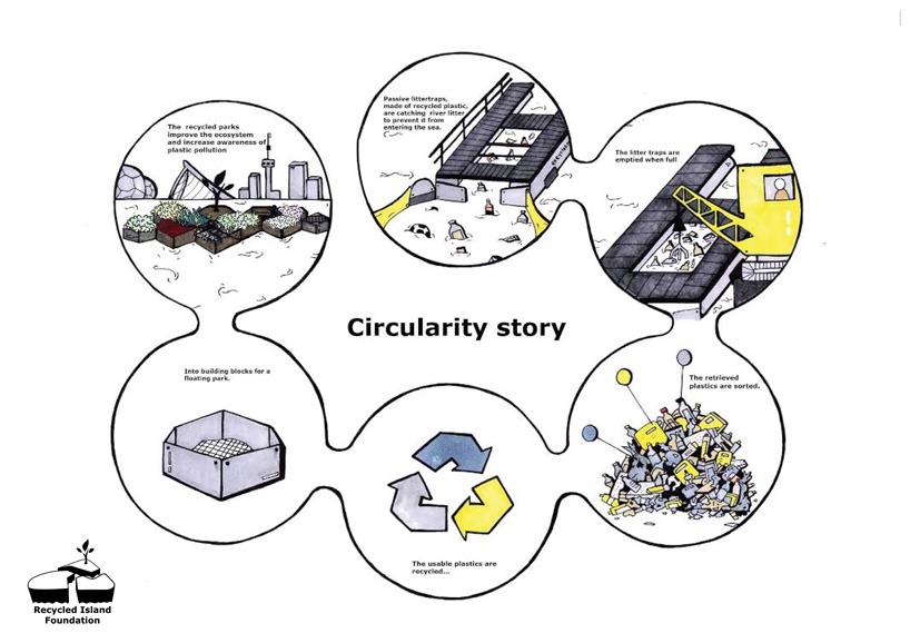 Composto por uma série de blocos hexagonais, o parque flutuante de 140m2, além de chamar atenção para o problema dos lixos nas águas e da possibilidade de reciclagem do material, é benéfico para o ecossistema do rio, pois oferece um habitat para micro e macro fauna, incluindo caracóis, vermes, besouros e peixes.