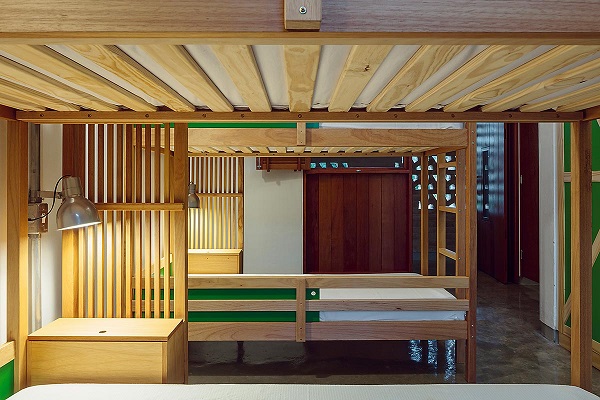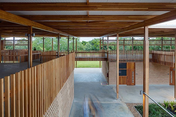 Cada pavilhão abriga cinco dormitórios, todos voltados para o jardim. As paredes dos dormitórios voltadas para o exterior formam uma antecâmara vedada por tijolos formando cobogós, permitindo a ventilação natural.