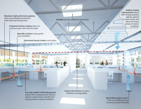 Uma grande quantidade de claraboias estão dispostas na cobertura, permitindo que tanta luz natural que o edifício só precisará de iluminação artificial diurna por cerca de 40 dias por ano.