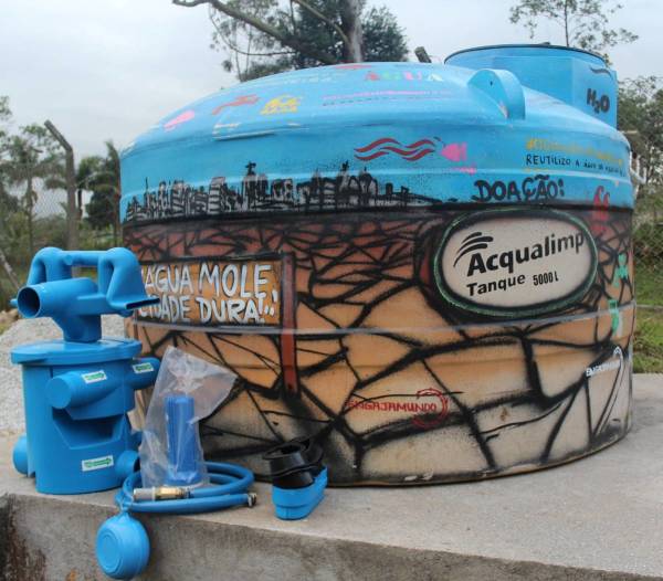 O reservatório que será instalado na casa Ecoativa foi doado pela causa “Água, cuido porque amo” e Acqualimp durante o evento de comemoração do Dia Mundial da Terra, realizado em 22 de abril no vão do Museu de Arte de São Paulo Assis Chateaubriand (MASP), em São Paulo. Durante o evento, o tanque foi estilizado pelo artivista Tiago Mundano, numa ação que contou com a ajuda da população que passou pelo local.