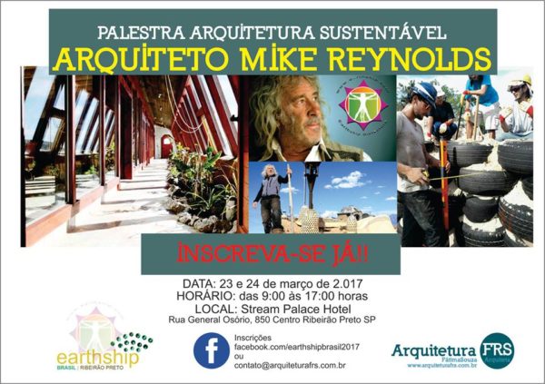 Palestra Mike Reynolds em Ribeirão Preto – SP , dias 23 e 24 de março- Pela primeira vez no Brasil, o Arquiteto falará sobre seu trabalho no qual desenha e constrói pessoalmente casas totalmente autossuficientes, feitas na sua maioria com materiais naturais e reciclados.