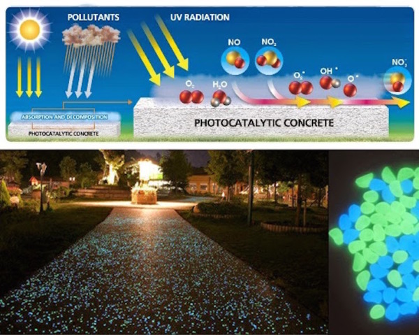 Pavimentação que brilha no escuro – Dentro deste concreto, elementos foto-luminescentes irão fornecer uma fonte de luz ambiente, similar às estradas brilhantes que estão sendo testado na Holanda, estas adições não são radioativas nem tóxicas. Absorvem a energia solar durante o dia e, lentamente, soltando-o depois de escurecer.