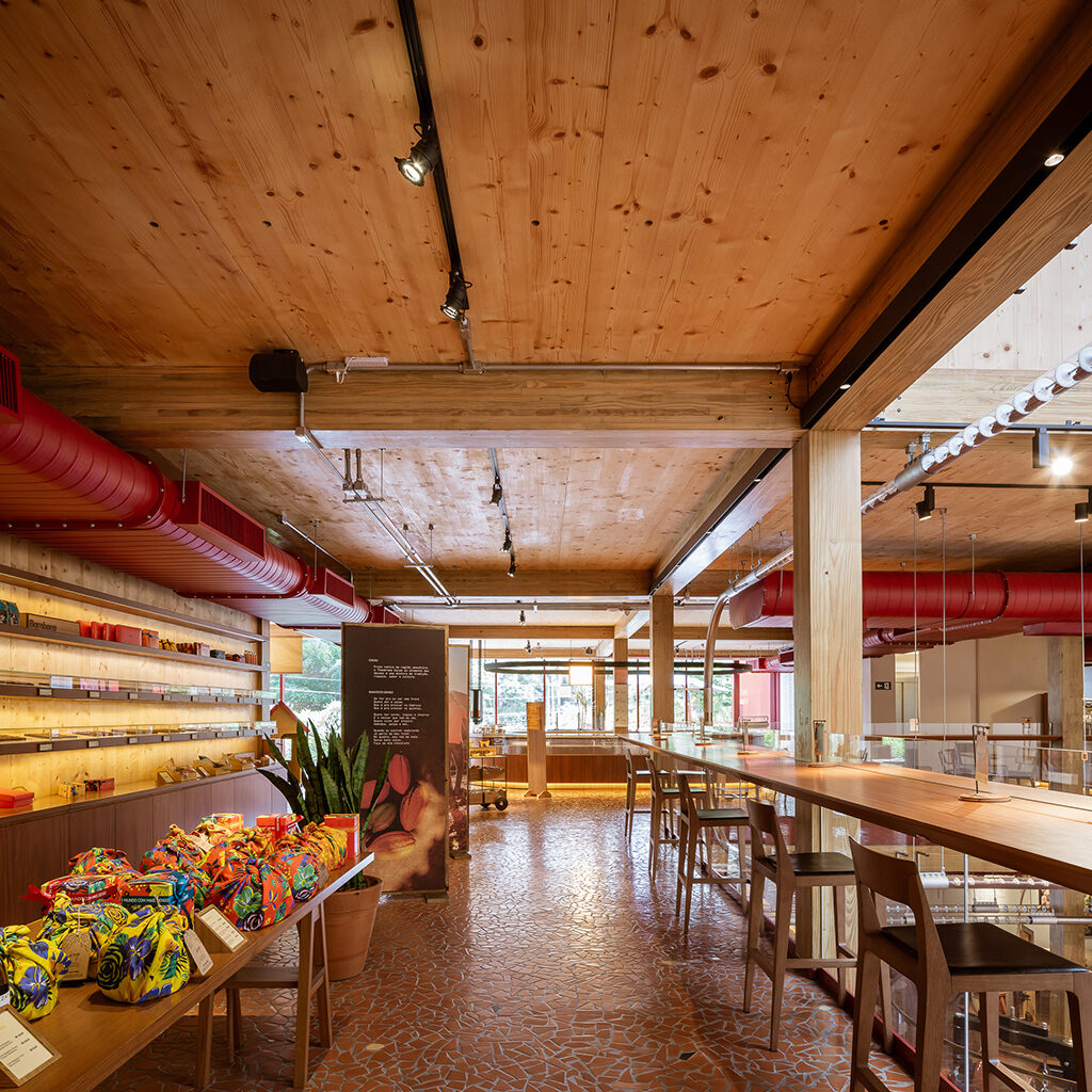 Ele também remete ao piso vermelho das fazendas de cacau na Bahia. As cores da fruta também ditaram a paleta escolhida que ficou entre o vermelho, o amarelo e o preto, com destaque para a madeira da estrutura aparente no interior da loja.