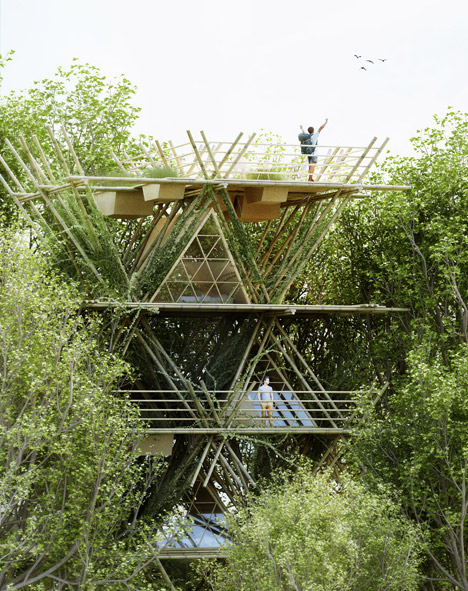 O projeto em bambu, “One With The Birds” – um entre os pássaros –  foi desenvolvido para a  “AIM Legend of the Tent” que acontece na China. A competição convocou arquitetos para projetar um hotel- tenda com baixo impacto ambiental.