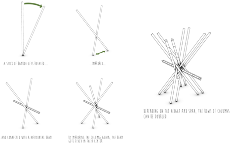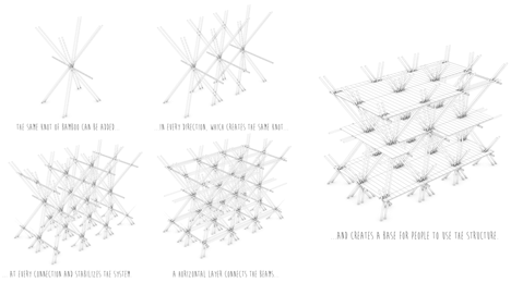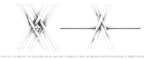 As juntas seriam amarradas com corda, ao invés de fixos com pregos, mantendo intacto o bambu para que ele possa ser desmontado e reutilizado em outros projetos.