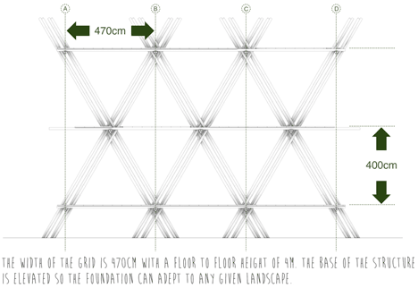 O espaço de cada módulo é de 4,7 m na horizontal e 4m na vertical. A estrutura seria levantada um pouco acima do chão, para que as alterações dos níveis possam ser facilmente ajustadas.