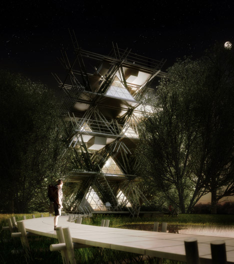 O escritório de arquitetura Penda – um coletivo de design com sede em Viena e Pequim –  desenvolveu este projeto conceito feito de varas de bambu, projetado para levar os hóspedes mais perto da natureza. O conceito é de um hotel portátil que pode ser movido e ampliado com facilidade.