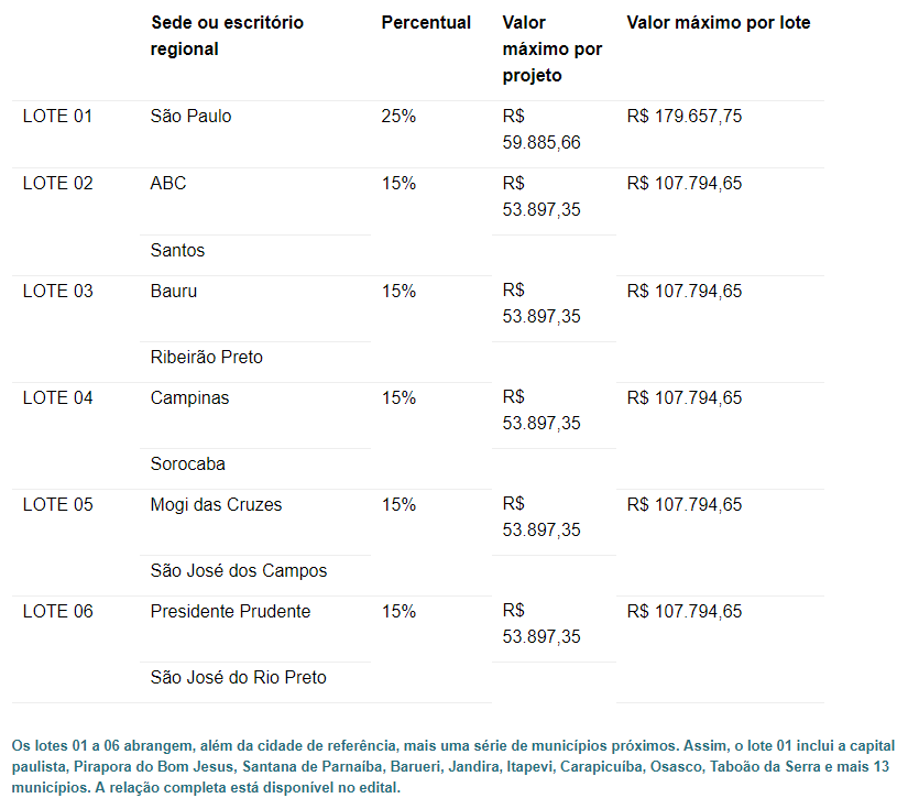 Este edital deve destinar um valor máximo de R$ 718.631,00 aos projetos contemplados. Esse valor será distribuído em seis lotes de propostas, conforme a tabela abaixo: