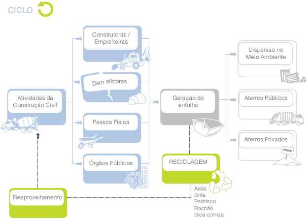 A indústria da construção civil no Brasil deve gerar 100 milhões de toneladas de entulho até o final de 2013. 90 milhões são resíduos da construção e demolição, sendo que só 10% têm algum tipo de reaproveitamento – 3% são reciclados e 7% são usados sem passar por qualquer tipo de beneficiamento, geralmente para tapar buracos, e têm baixo valor agregado.