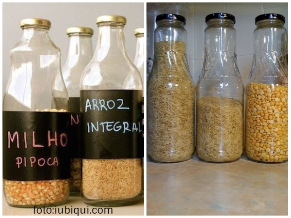 Aquelas garrafas de sucos são ótimas para reutilizar para guardar alimentos, você evita o descarte e ainda economiza, pois não precisa comprar potes novos para esse fim. Basta higienizar bem e está pronto para uso.