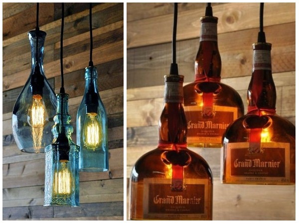 Existem diversos exemplos de luminárias pendentes que podem ser feitas com garrafas de vidro, pode ser de vinho, Whisky, gin, cerveja, basta usar a imaginação.