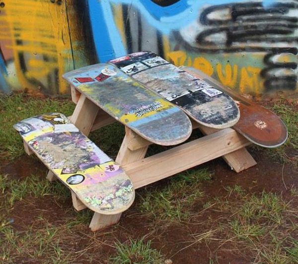 Esta mesa de piquenique portátil é um barato, e as crianças vão adorar. Os shapes desgastados são reaproveitados para criar a mesa e os bancos, e ainda podem receber outra arte ou serem pintados.