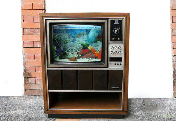 Essa televisão antiga dificilmente funcionaria nos dias de hoje, mas a reutilização como um suporte de aquário deixa o ambiente muito mais charmoso.
