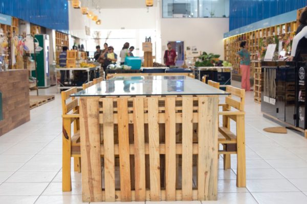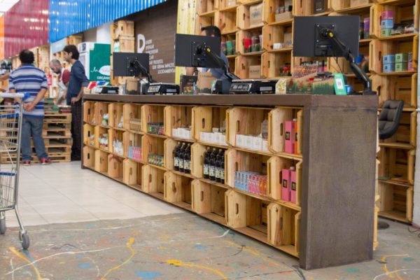 Os caixotes de madeira, foram encontrados pelos proprietários, em uma feira do Sebrae. Material este que seria descartado e eles conseguiram comprar, e reutilizar como mobiliário no supermercado.