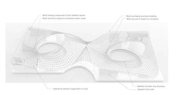 O Centro Cultural Thread tem materiais naturais e tradicionais; como a palha, o bambu e o barro, mas sua forma foi desenvolvida através da parametrização, uma das mais avançadas tecnologias de projeto.
