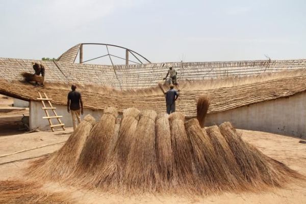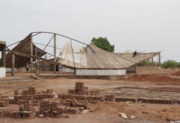 Moradores e pedreiros locais forneceram seus conhecimentos de como trabalhar com os materiais locais, enquanto a arquiteta inovou na aplicação desses materiais em uma nova geometria, criando uma estrutura espetacular, com um grande vão livre, que protege o povo da aldeia da chuva e do calor intenso.