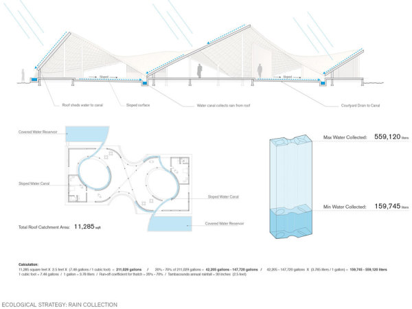 Mas o exemplo mais surpreendente desta mistura colaborativa é o telhado. Construído em palha, um costume local, foi desenhado para captar a maior quantidade possível de água da chuva.